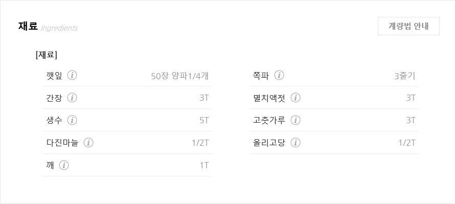 간장3T. 멸치액젓3T. 생수5T, 고춧가루3T. 다진마늘1/2T. 올리고당1/2T. 깨1T