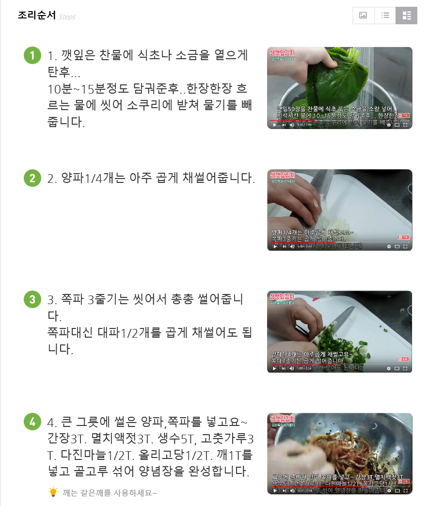 재료(4인분) : 깻잎50장. 양파1/4개. 쪽파3줄기(또는 대파1/2개).