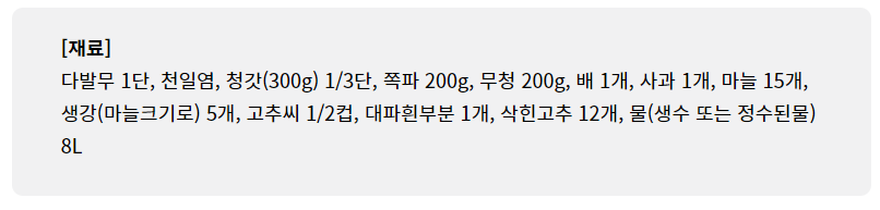 배1개,사과1개,마늘15개,생강5개(마늘크기로),고추씨1/2컵,대파흰부분1개,
