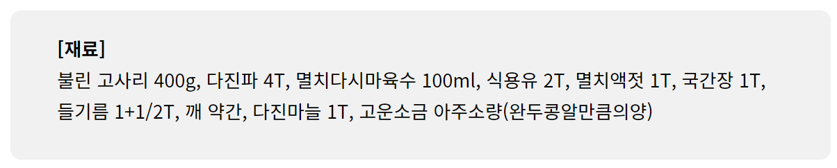 재료: 불린고사리400g. 다진파4T. 멸치다시마육수100ml. 식용유2T.