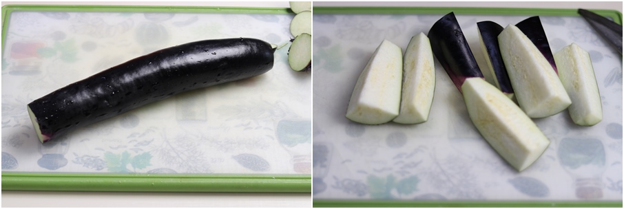 2. 가지를 씻어준후 반을 가른후 4등분씩 썰어줍니다.