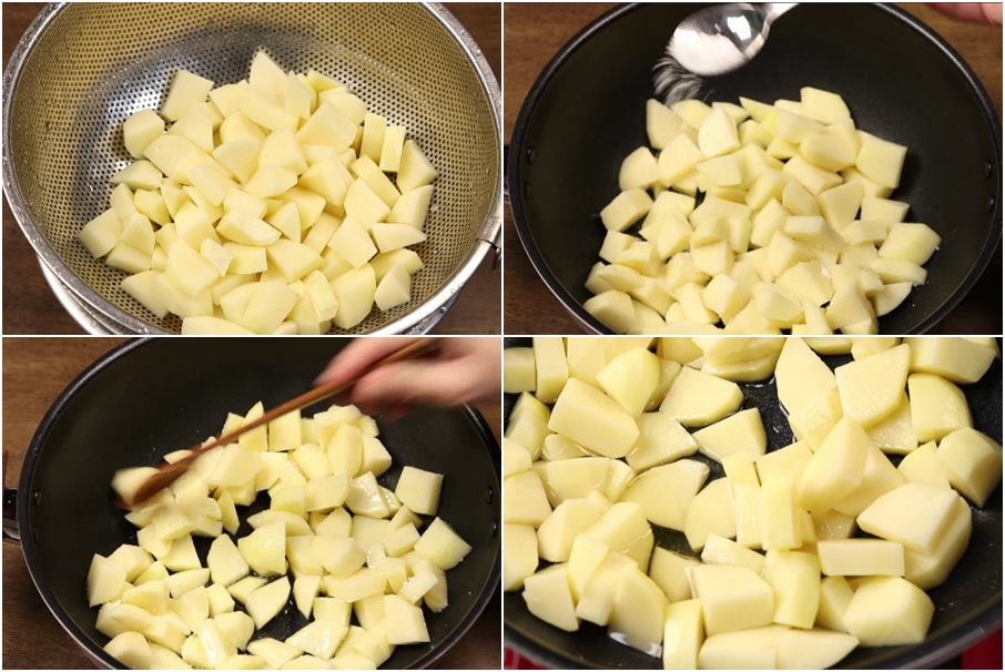 2. 녹말기 제거한 감자를 소쿠리에 받쳐 물기를 제거후~ 볶아줄 팬에 넣어줍니다.