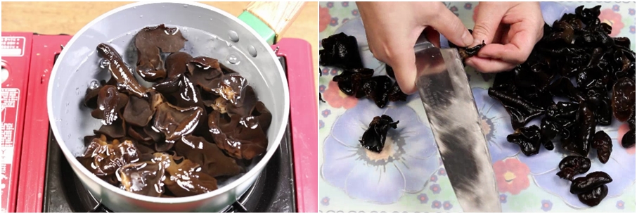 끓는물에 목이버섯을 넣고 살짝 데쳐준후 바로 찬물에 헹궈준후~ 먹기좋게 썰어주는데요..