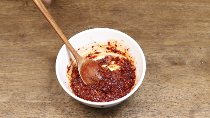 그릇에 고춧가루2T반.다진마늘1T.고추장1T.된장1/2T.미림1T.멸치액젓1T.국간장2T.