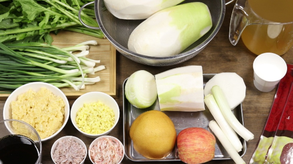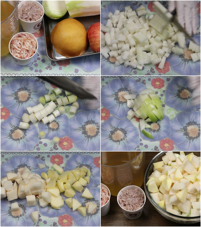 재료:배추6포기,무2개+700g,홍갓400g,깐쪽파200g,배1/2개,사과1/2개,대파흰부분3개,
