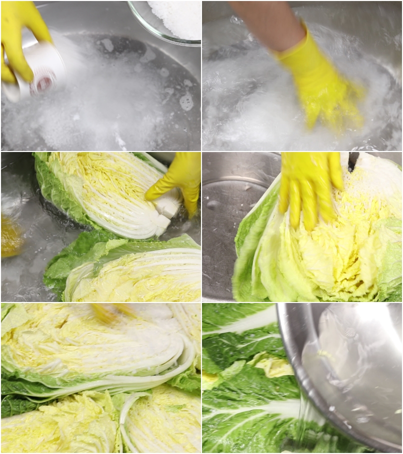이렇게 만든 소금물에 손질한 배추를 넣어줍니다.
