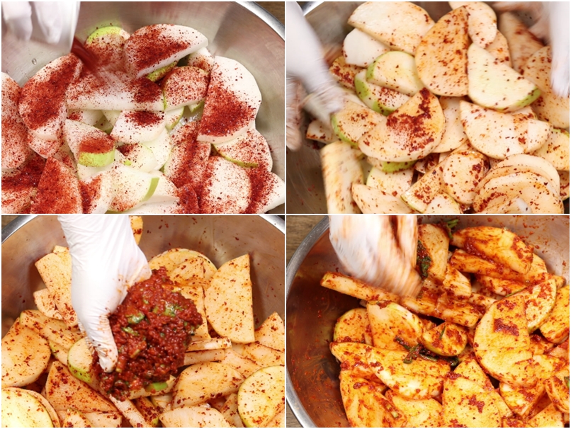 => 절인 석박지를 씻어 고춧가루물 들이고~김치양념 한줌정도 넣어 버무려 석박지완성~