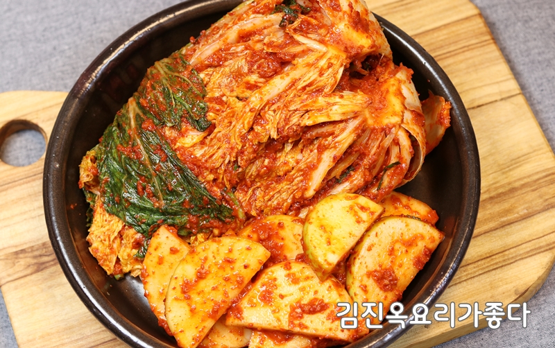 => 절여서 물기뺀 배추에 김치양념 잘 버무려 김치통에 석박지와 함께 섞어 넣으면 완성입니다.