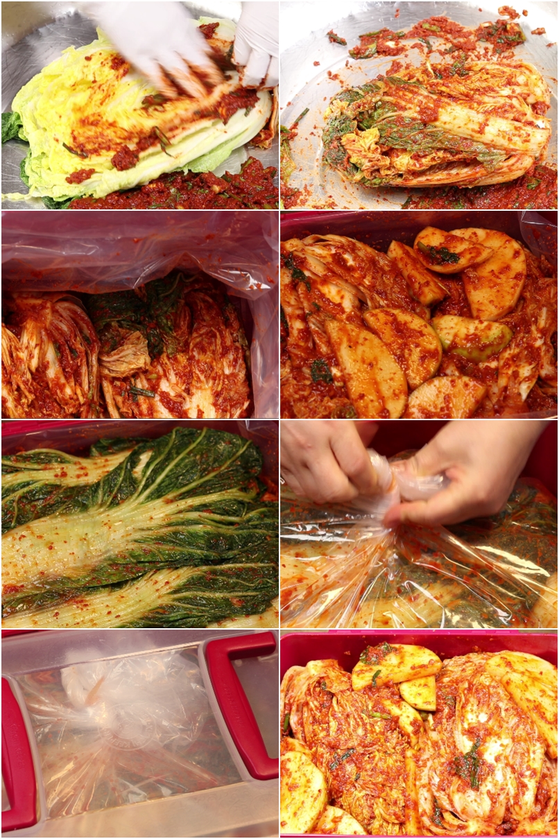김장김치를 오랫동안 맛있게 숙성시키려면 김치통에 김장비닐을 씌어준후~