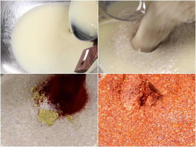 => 큰 그릇에 식혀준 찹쌀풀 넣고~믹서기에 갈은거 넣고~멸치액젓.다진마늘.다진생강.소금.설탕.고춧가루