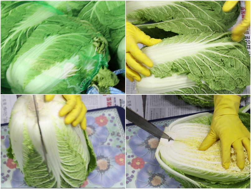 3. 배추밑둥부분 살짝 제거하시고요~배추를 반을 갈라주는데요~칼로 배추의 중간부분까지만