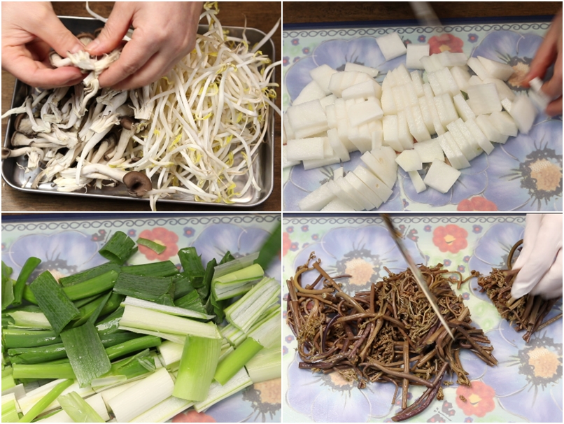 무1/2개(흰부분으로 500g). 대파3개. 삶은고사리300g. 숙주300g. 느타리버섯200g.