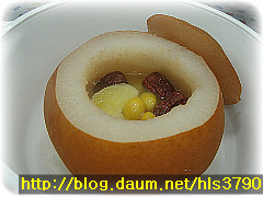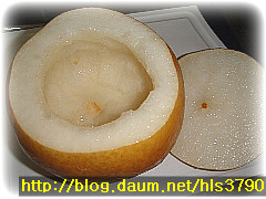 1. 배를 잘 씻어 위에 꼭지 부분을 1.5cm~2cm정도 잘라낸후 배안에 속살을 수저로팝니다.