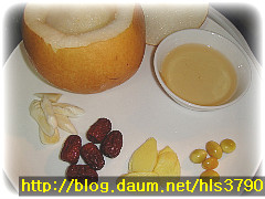 속살을 판 배속에 도라지.생강.은행.대추를 넣고 꿀을 1T~2T넣어줍니다.