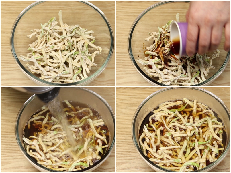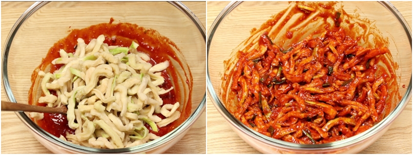 4. 준비한 양념장에 불린 무말랭이를 넣고 조물조물 무치면 무말랭이무침 완성입니다.