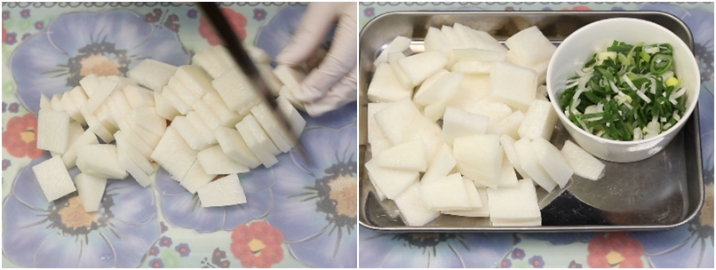 3. 닭삶는동안 무와 고명으로 사용할 대파를 총총 썰어줍니다.