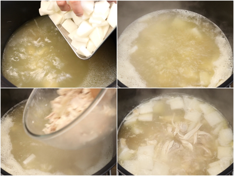 6. 닭육수에 썰어놓은 무를 넣고요~센불에서 끓으면 중불로 줄여 5분동안 끓인후~