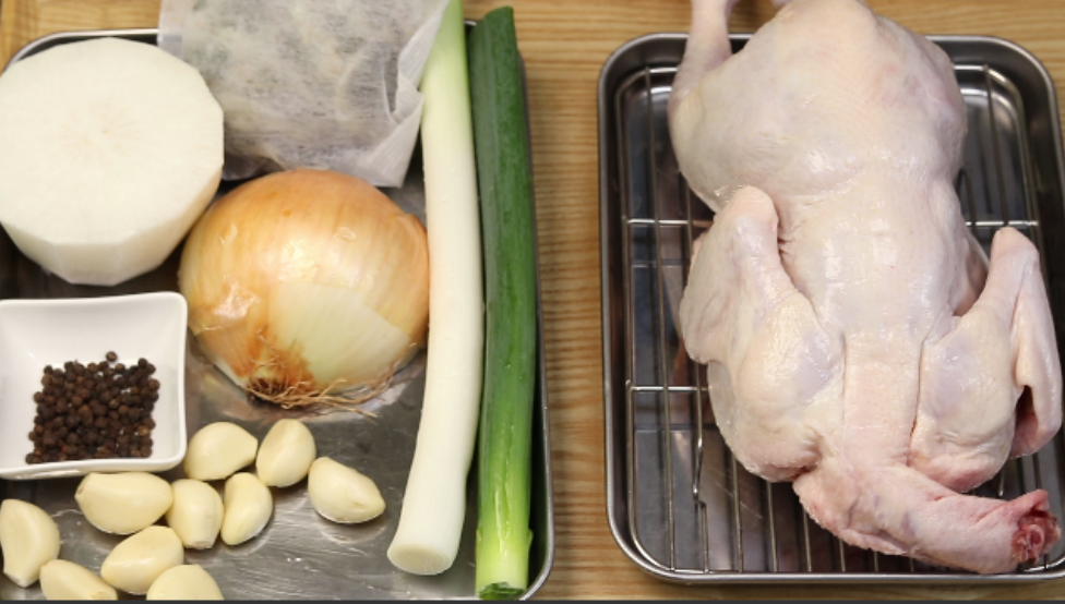 재료(5인분정도): 닭1마리(1키로). 대파1개.양파1/2개.통마늘10개.통후추1T.멸치다시마육수팩1개.
