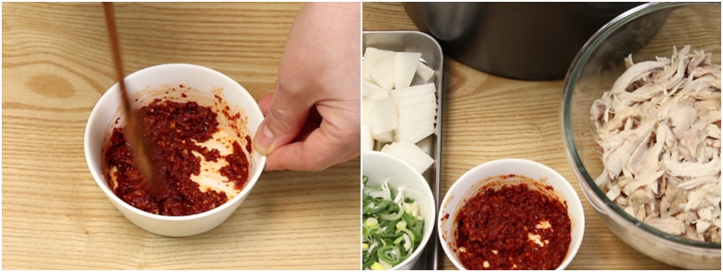 그릇에 고춧가루1T반.다진마늘1/3T.국간장1T.삶은닭육수3T.후춧가루소량을 섞어 양념장
