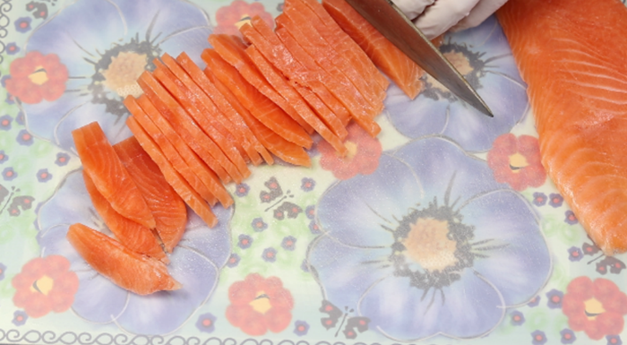 5. 마지막으로 생연어를 먹기 좋게 썰어준후~