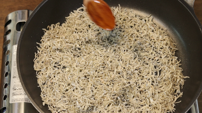 2. 약불로 켠후 5분정도 멸치에 식용유가 골고루 코팅이 되도록 노릇하게 볶아줍니다.
