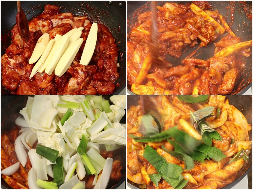 뒤적이면서 중불에서 닭갈비살이 완전히 익을때까지 볶아줍니다.