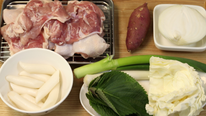재료(4인분):닭다리살 700g. 양파1/2개(작을때는 1개준비). 대파1개. 고구마작은거1개.떡볶이떡 150g.