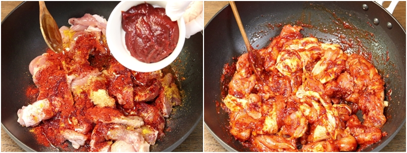 2. 썰어놓은 닭다리살을 볶음팬에 넣고요~ 양념을 해줍니다.