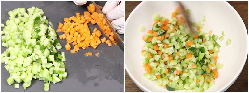 오이는 잘게 썰어줍니다. 당근소량(2cm길이정도) 잘게 썰어줍니다.