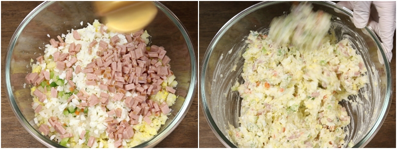7. 감자와 노른자 으깬곳에...준비한 오이.당근.양파.흰자.햄 넣고요~~