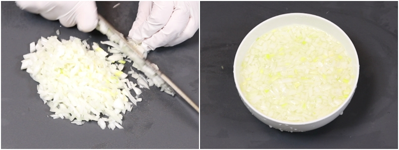 3. 양파1/2개는 곱게 다져준후 찬물에 10분정도 담궈 매운내를 제거합니다~