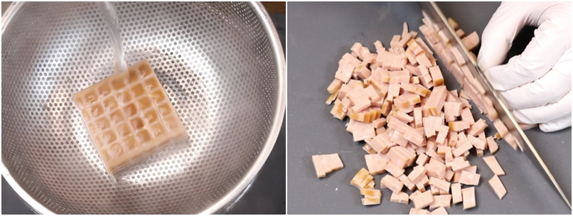 4. 햄은 뜨거운물에 튀겨주거나 뜨거운물에 살짝 끓여준후~~키친타올로  수분기를 제거하고 잘게 썰어줍니다.