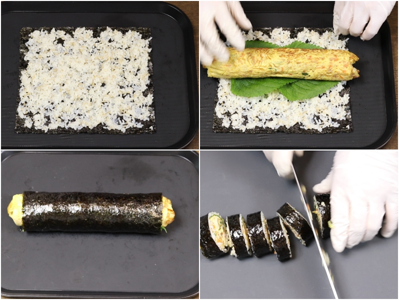 깻잎2장 올려주시고요~ 그 위에 계란말이 1개 올려준후...돌돌 말아준후...김밥의 표면에 참기름 소량 발라준후..