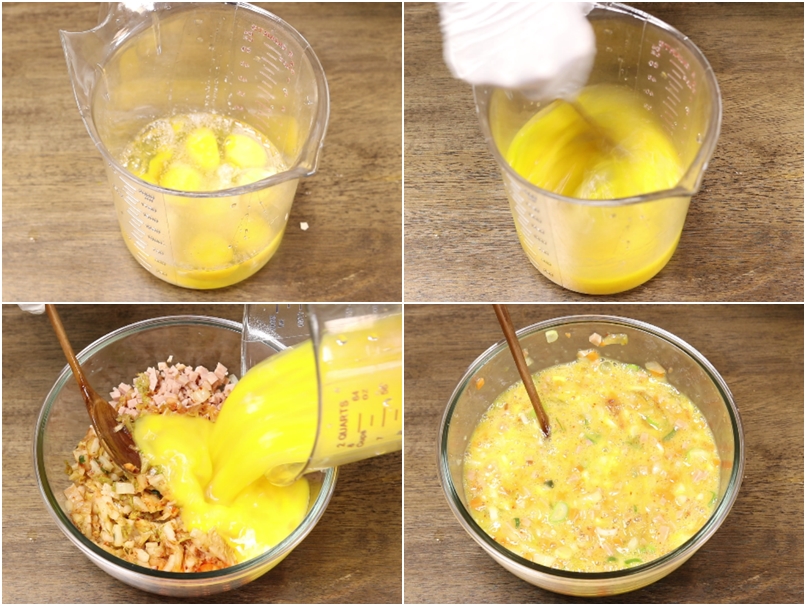 4. 위 2번에서 준비한 양파.햄.당근.김치에 다진파5T를 그릇에 넣고요~ 계란푼물을 부어준후...