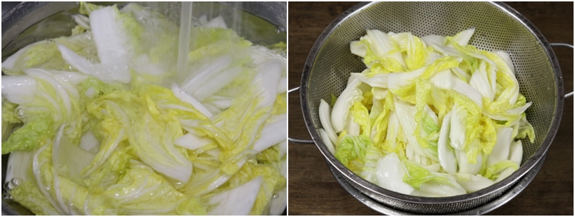 6. 1시간 절여진 배추를 찬물에 두세번 세척후 체에 받쳐 30분동안 물기를 빼줍니다.