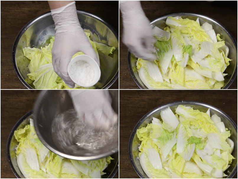 남은 소금을 물1컵에 잘 녹인후 배추위에 골고루 뿌려준후 1시간 절여줍니다.