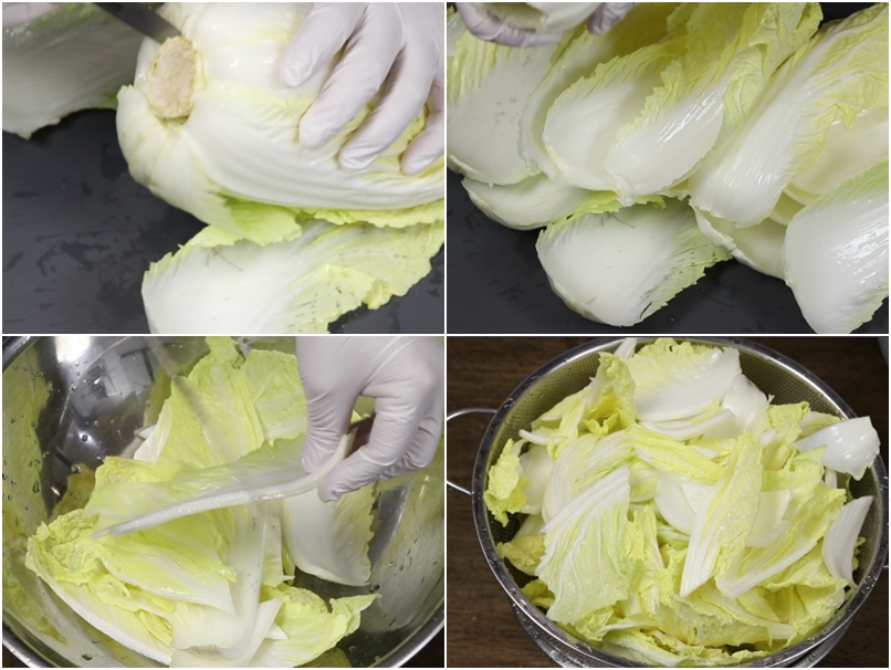 1.배추밑둥의 심지를 칼로 도려낸후 배추잎을 한장한장 떼어냅니다