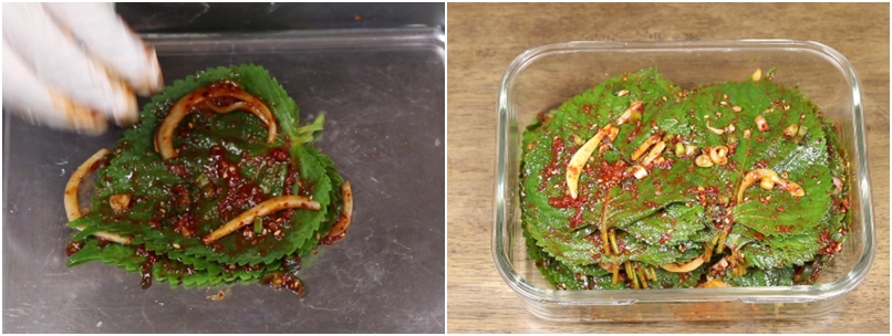 4. 깻잎에 준비한 양념장을 한장한장 발라준후 용기에 차곡차곡 담아주면 완성입니다.