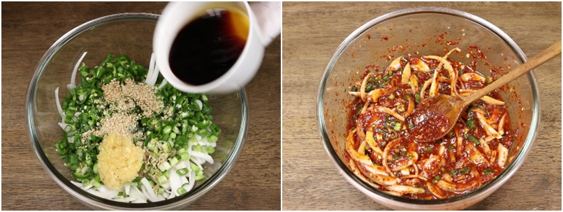 3. 그릇에 썰어놓은 양파.쪽파.고추 넣고요~ 다진마늘1T.깨2T.멸치액젓6T.간장6T.고춧가루5T.물100ml.