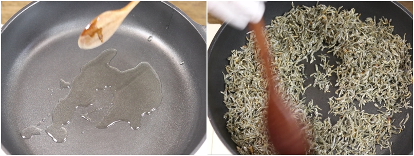 2. 팬에 식용유2T를 넣고요~ 멸치를 넣은후~ 골고루 식용유가 멸치에 스며들게 버무린후 약불에서 4~5분정도