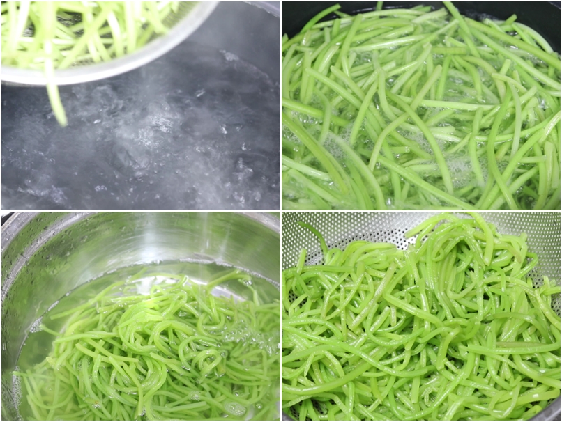 4~5분정도 데쳐줍니다. 제가 구입한 고구마줄기가 얇아서 4분 데쳤는데요~ 고구마줄기라 굵을때는 5분정도