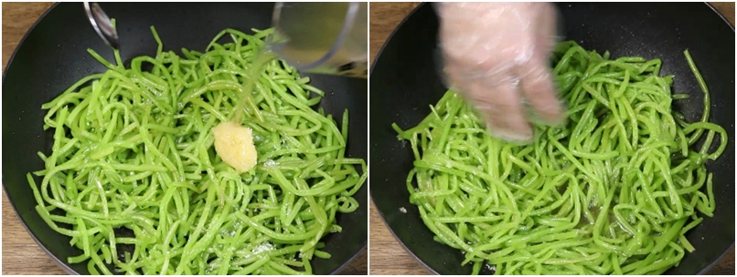 3. 데친 고구마줄기를 볶음팬에 넣고요~ 다진마늘1T.국간장2T.소금1/4T정도.식용유1T반.멸치다시마육수150ml를