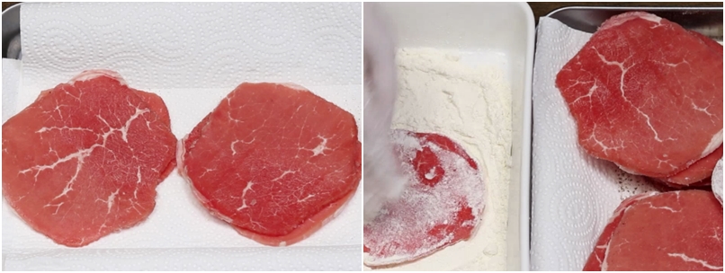 핏기제거한 고기에 고운소금.후춧가루를 골고루 뿌린후 부침가루를 앞뒤면 얇게 묻혀줍니다~