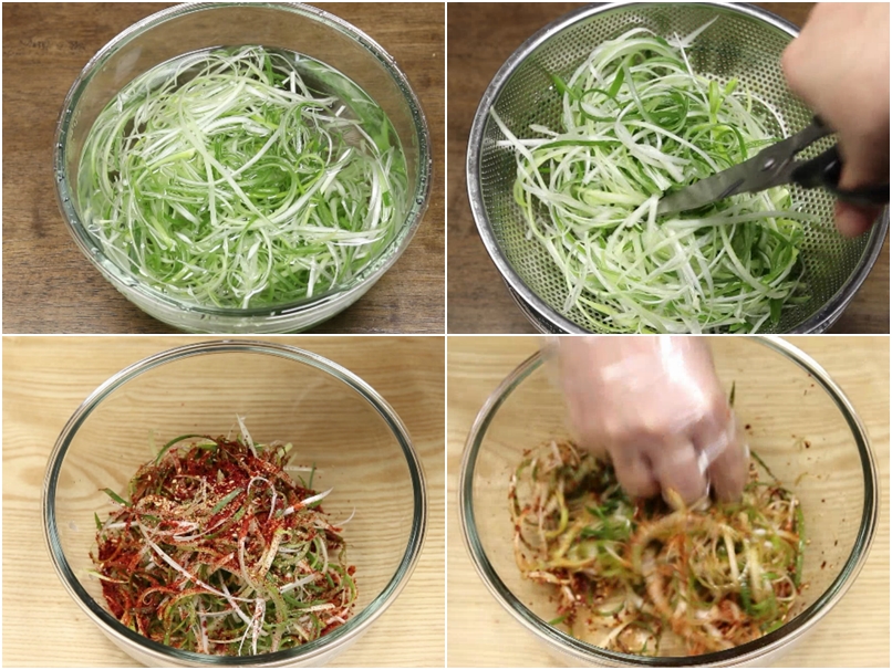 3. 육전을 부치는 동안 파채를 찬물에 10분정도 담궈 매운내를 제거해줍니다~