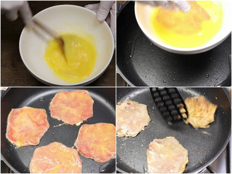 팬에 식용유를 두르고 약불에서 달아오르면 부침가루 묻힌 고기를 계란물에 빠트린후~ 앞뒤면 노릇하게