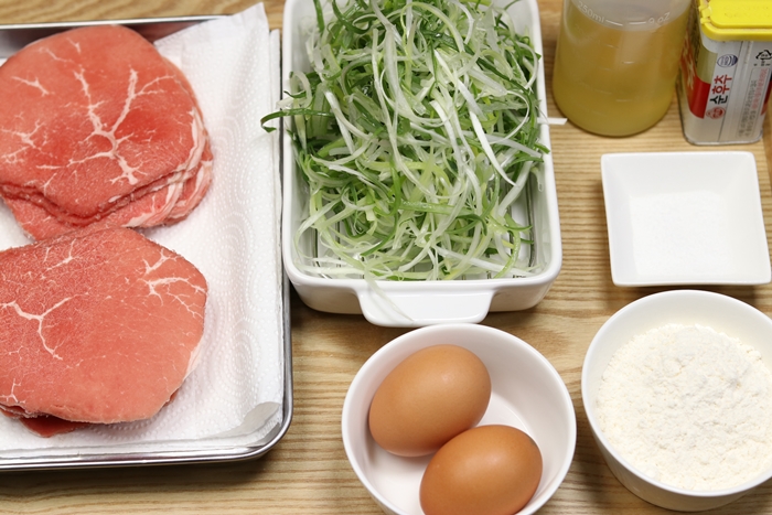 재료: 소고기 400g(홍두깨살).고운소금.후춧가루.식용유.부침가루.계란2~3개정도.