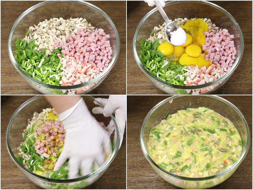 4. 준비한 버섯.햄.쪽파.맛살을 큰 그릇에 담고요~
