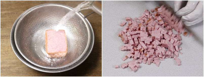 2. 햄은 뜨거운 물에 살짝 튀긴후~ 잘게 썰어줍니다.