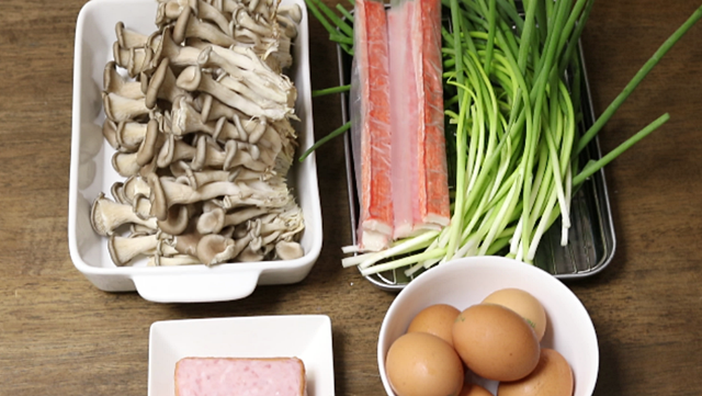 재료(5~6인분):느타리버섯400g.햄150~200g.맛살5줄기.쪽파한줌(또는 실파).
