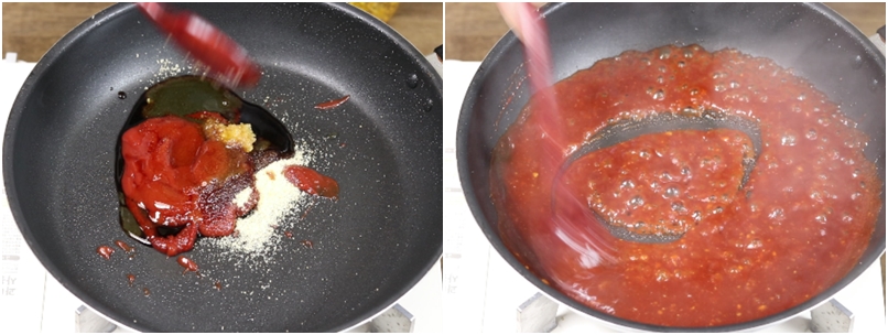 4. 팬에 고추장1T.케찹2T반~3T.설탕1T. 다진마늘1/2T.간장1T.올리고당2T. 물3T를 넣고 약불에서 1분정도